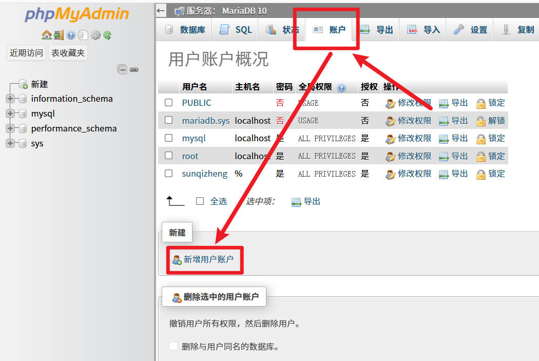1、在群晖中安装php和phpmyadmin,打开phpmyadmin,新建一个数据库用户。