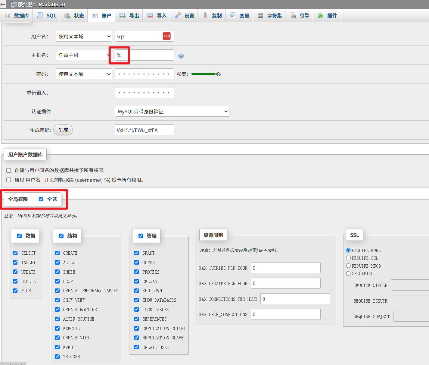 2、新建的用户,主机名写%(如果是localhost,表示只能当前主机内部访问,%表示不限制访问)